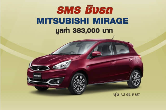 รางวัลที่ 1 รถยนต์ มิตซูบิชิ มิราจ 1.2 จีแอล 5 เอมที มูลค่า 383,000 บาท