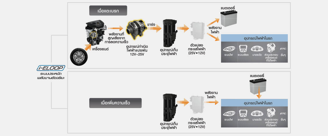 ระบบประหยัดน้ำมันที่สั่งให้เครื่องยนต์หยุดการทำงานชั่วคราวเมื่อรถจอดนิ่ง ขณะที่อุปกรณ์ต่างๆ ภายในรถยังคงทำงานตามปกติ ด้วยพลังงานไฟฟ้าจาก i-ELOOP ทั้งสองระบบทำงานคู่กัน เพื่อประหยัดน้ำมันเชื้อเพลิงได้อย่างมีประสิทธิภาพ และเครื่องยนต์จะทำงานอัตโนมัติทันทีเมื่อรถพร้อมออกตัว