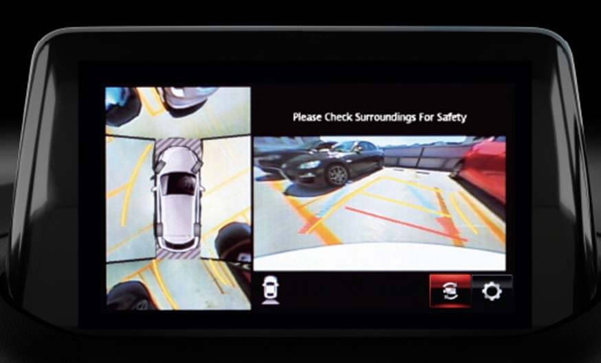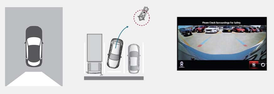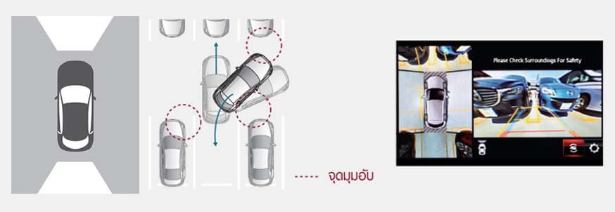 ภาพจากมุมสูง ภาพจากกล้องด้านหน้าและหลัง ระบบจะแสดงภาพจากมุมสูง ภาพจากกล้องด้านหน้าและหลัง พร้อมเส้นแนวกะระยะตามทิศทางการเคลื่อนที่ของรถเพื่อช่วยให้ถอยเข้า-ออกจากบริเวณที่จอดง่ายขึ้น โดยเฉพาะในจุดที่ผู้ขับอาจมองไม่เห็น