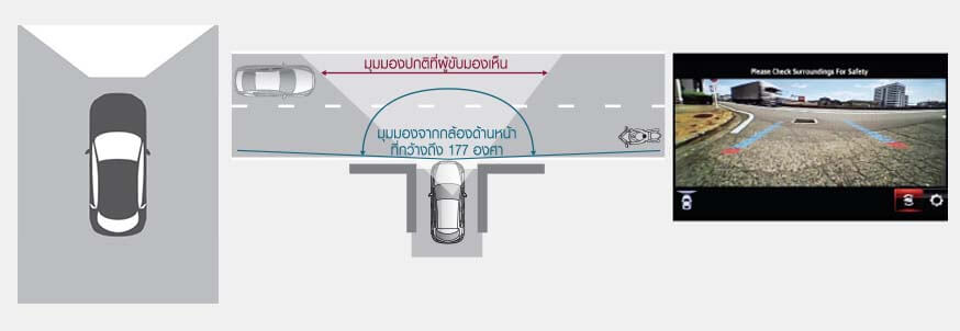 ภาพมุมกว้างจากกล้องด้านหน้า ในกรณีที่ออกจากซอยหรือทางแยก ระบบสามารถแสดงภาพมุมกว้างจากกล้องด้านหน้าในมุมมองที่กว้างถึง 177 องศา ซึ่งมากกว่ามุมมองปกติที่ผู้ขับมองเห็น