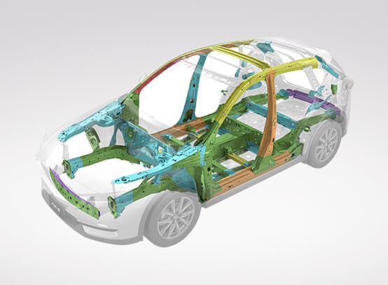 โครงสร้างตัวถังที่ผลิตจากเหล็กกล้าคุณภาพสูง High Tensile Steel น้ำหนักเบาและแข็งแกร่ง ให้การควบคุมรถที่มั่นคง ช่วยลดแรงสะเทือนจากถนน และกระจายแรงปะทะที่เข้าสู่ห้องโดยสารในกรณีที่เกิดอุบัติเหตุ
