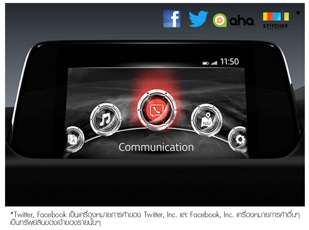 ล้ำหน้าไปกับเทคโนโลยีเชื่อมต่อโลกโซเชียล MZD CONNECT ใน มาสด้า ซีเอ็กซ์-5 ใหม่ ไม่พลาดทุกการติดต่อทั้งเรื่องงาน และครอบครัวอัพเดทข้อมูลข่าวสารได้ตลอดการเดินทาง หรือรับ-ส่ง SMS จากสมาร์ทโฟนผ่านสัญญาณ Bluetooth พร้อม Infotainment ที่มีให้เลือกมากมายในแอพพลิเคชั่น Aha by HARMANTM รวมถึงระบบนำทาง Navigator*