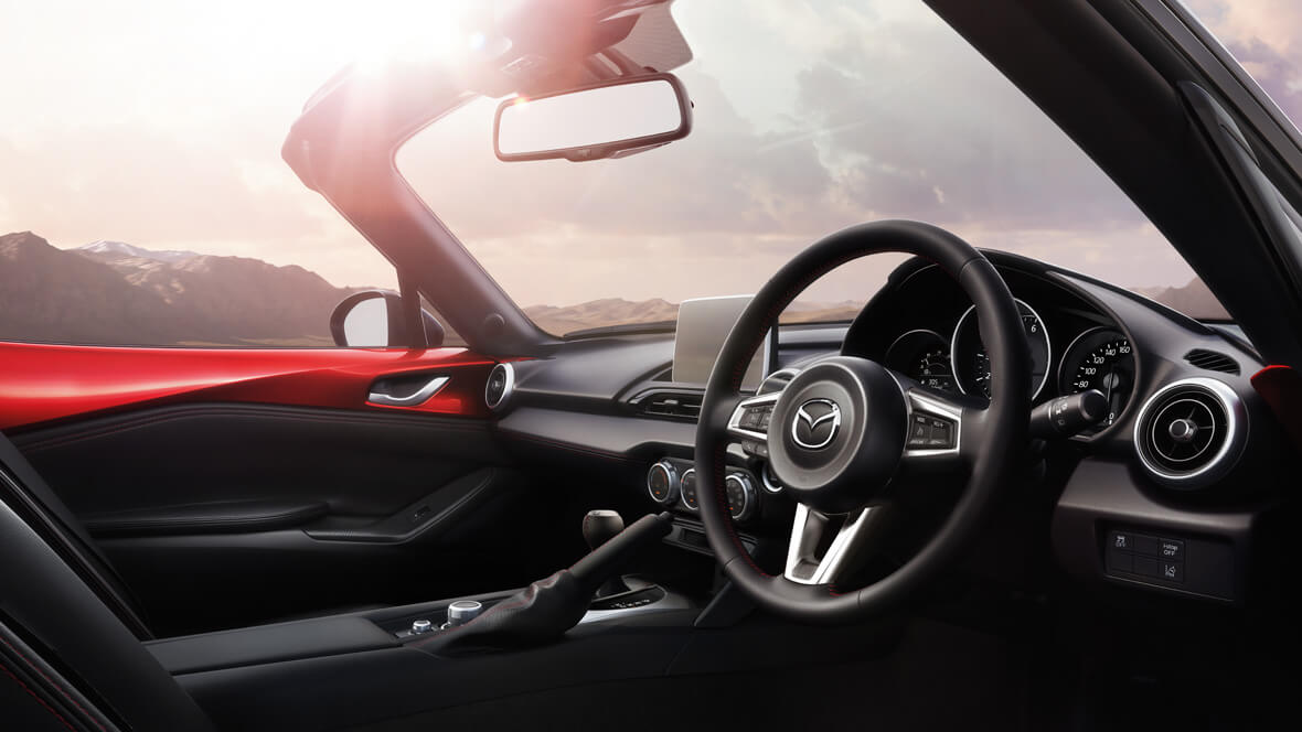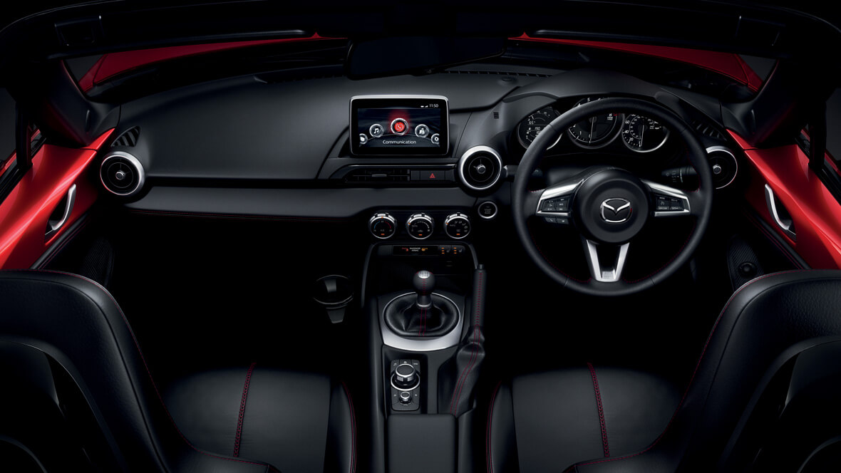 All New Mazda MX-5 ถูกออกแบบโดยหลักปรัชญาความเป็นหนึ่งเดียวกับตัวรถ จินบะ อิไต (Jinba Ittai) ที่วางตำแหน่งต่างๆ ให้สามารถสังเกต และควบคุมได้ง่ายเพื่อเพิ่มประสิทธิภาพ และความสะดวกสบาย สำหรับการออกแบบแผงคอนโซลที่ให้ความเรียบง่าย แต่สปอร์ตด้วยธีมสีดำ แซมด้วยสีแดงกับวัสดุโลหะสีเงิน ทั้งพวงมาลัย, เบาะ, แผงประตูด้านใน, หัวเกียร์และเบรคมือหุ้มหนังสีดำ, มาตรวัดแบบหน้าปัดเรืองแสง 3 วง ที่มาพร้อมกับจอแสดงข้อมูลการขับขี่แบบดิจิตอล