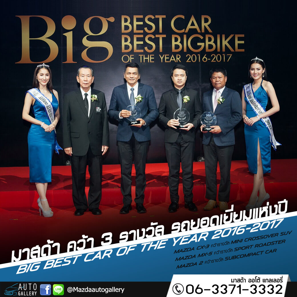 บริษัท มาสด้า เซลส์ (ประเทศไทย) จำกัด รับรางวัลอันทรงเกียรติ BIG Best Car of The Year 2016-2017 โดยปีนี้คว้ามาได้ถึง 3 รางวัล จากรถมาสด้า 3 รุ่น ที่กำลังฮ็อตที่สุดในเวลานี้ ได้แก่ Mazda CX-3 พิชิตรางวัล Mini Crossover SUV แฮนด์ลิ่งสุดประหยัด, Mazda MX-5 คว้ารางวัล Sport Roadster ขับสนุก และ Mazda2 ครองรางวัล Subcompact Car คุ้มค่าครองใจผู้ใช้ ซึ่งพิจารณาคัดเลือกโดยคณะกรรมการผู้ทรงคุณวุฒิจากบริษัท ยานยนต์สแควร์ กรุ๊ป จำกัด ผู้จัดงานมหกรรมยานยนต์เพื่อขายแห่งชาติ หรือ BIG Motor Sale 2017 และผู้ผลิตสื่อยานยนต์ที่มีประสบการณ์ยาวนานกว่า 30 ปี โดยมีนายจรวย ขันมณี (ที่ 2 จากซ้าย) ประธานคณะกรรมการอำนวยการจัดงาน Bangkok International Grand Motor Sale 2017 ให้เกียรติมอบรางวัลให้ กับนายเกริกฤทธิ์ คำสุระ (ที่ 3 จากซ้าย) ผู้อำนวยการอาวุโสฝ่ายการขายภูมิภาค นายพิเชษฐ์ ปุณณารักษ์ (ที่ 4 จากซ้าย) ผู้จัดการส่วนงานการขายภูมิภาค และนายอุทัย เรืองศักดิ์ (ที่ 5 จากซ้าย) ผู้จัดการส่วนงานประชาสัมพันธ์ บริษัท มาสด้า เซลส์ (ประเทศไทย) จำกัด ณ ห้องแกรนด์ฮอลล์ ชั้น 2 อาคารไบเทค บางนา