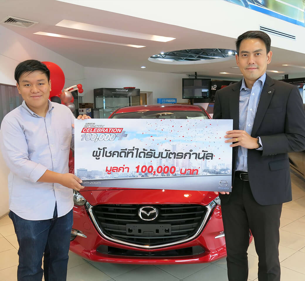 นายธีร์ เพิ่มพงศ์พันธ์ ผู้อำนวยการอาวุโสฝ่ายการตลาด บริษัท มาสด้า เซลส์ (ประเทศไทย) จำกัด มอบรางวัลให้กับลูกค้ามาสด้า จากแคมเปญ MAZDA SKYACTIV CELEBRATION 100,000+ ชวนร่วมลุ้นเป็นผู้โชคดีช่วงโค้งสุดท้ายก่อนจบแคมเปญ เพียงจองรถมาสด้ารุ่นใดก็ได้ รับสิทธิ์ลุ้นเป็นผู้โชคดีรับบัตรกำนัลมูลค่า 100,000 บาท