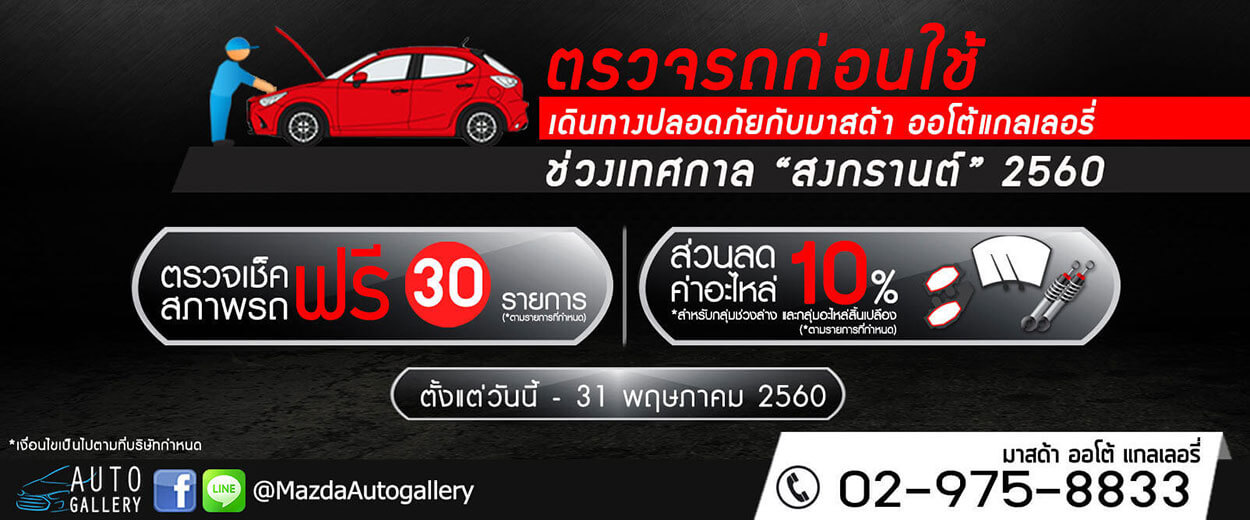 เพื่อเป็นการเตรียมความพร้อมรถยนต์ของลูกค้า ก่อนและหลังเดินทางในช่วงเทศกาล "สงกรานต์" ศูนย์บริการมาสด้า ออโต้ แกลเลอรี่ จึงได้จัดแคมเปญ "ตรวจรถก่อนใช้ เดินทางปลอดภัยกับมาสด้า ออโต้ แกลเลอรี่" เพื่อสร้างความมั่นใจในการใช้รถ ทั้งก่อนและหลังเดินทางไกล และเพื่อเป็นการรณรงค์ ป้องกัน ลดอุบัติเหตุทางถนนเพื่อเสริมสร้างความปลอดภัยในการใช้รถใช้ถนนในช่วงเทศกาลสงกรานต์ ปี 2560 โดยมีรายละเอียดคือ ตรวจเช็คสภาพรถฟรี 30 รายการ พร้อมให้ส่วนลดค่าอะไหล่ 10% สำหรับกลุ่มช่วงล่าง และกลุ่มอะไหล่สิ้นเปลือง