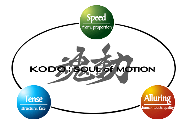 มาสด้าได้นำการเคลื่อนไหวโดยฉับพลันแบบนี้ ที่เต็มเปี่ยมไปด้วยพละกำลัง ความรวดเร็ว และการแสดงออกอย่างน่าเกรงขามให้เป็นแนวทางของการขึ้นรูป งานดีไซน์ และเป็นการให้คำนิยามของ โคโดะ ‘KODO’ ที่มาสด้าจะใช้ในการออกแบบรถยนต์มาสด้าให้มีภาพลักษณ์ของความเร็ว ความทรงพลัง รวมถึงองค์ประกอบต่างๆ ทำให้ดูมีชีวิตชีวา และแสดงออกถึงจิตวิญญาณ ‘KODO: SOUL of MOTION’ เป็นภาษาการออกแบบใหม่ที่เป็นตัวแทนของ รถมาสด้าเจนเนอเรชั่นใหม่
