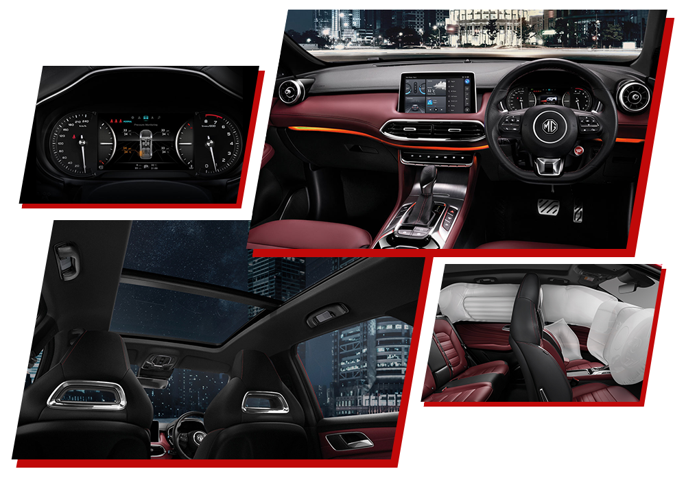 NEW MG HS ถูกออกแบบภายในที่เต็มไปด้วยเสน่ห์ที่น่าหลงใหล ภายในสีทูโทน ตกแต่งด้วยวัสดุ SOFT TOUCH หรูหรา มีเอกลักษณ์ พิถีพิถันในทุกรายละเอียด ให้ความประทับใจในทุกการสัมผัส มาพร้อมเบาะหนังคู่หน้าแบบ SPORT BUCKET SEAT หนังสีดํา-แดง บ่งบอกถึงรสนิยมที่เหนือระดับ เพื่อให้ทุกการเดินทางเป็นช่วงเวลาที่น่าจดจำ อีกทั้งดีไซน์ภายนอกยังถูกออกแบบให้มีความสง่างาม ซึ่งมรการผสานความหรูหรากับความสปอร์ตดุดันได้อย่างกลมกลืน พร้อมเอกลักษณ์อันโดดเด่นในแบบฉบับของ MG ที่จะทำให้คุณสะดุดตาตั้งแต่แรกเห็น